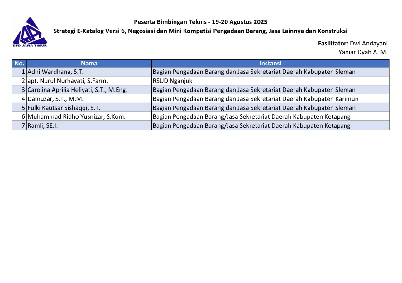 Berikut daftar nama peserta kegiatan “Bimbingan Teknis Strategi E-Katalog Versi 6, Negosiasi dan Mini Kompetisi Pengadaan Barang, Jasa Lainnya dan Konstruksi” tanggal 19-20 Agustus 2025. Download file daftar peserta: pdf & png.
