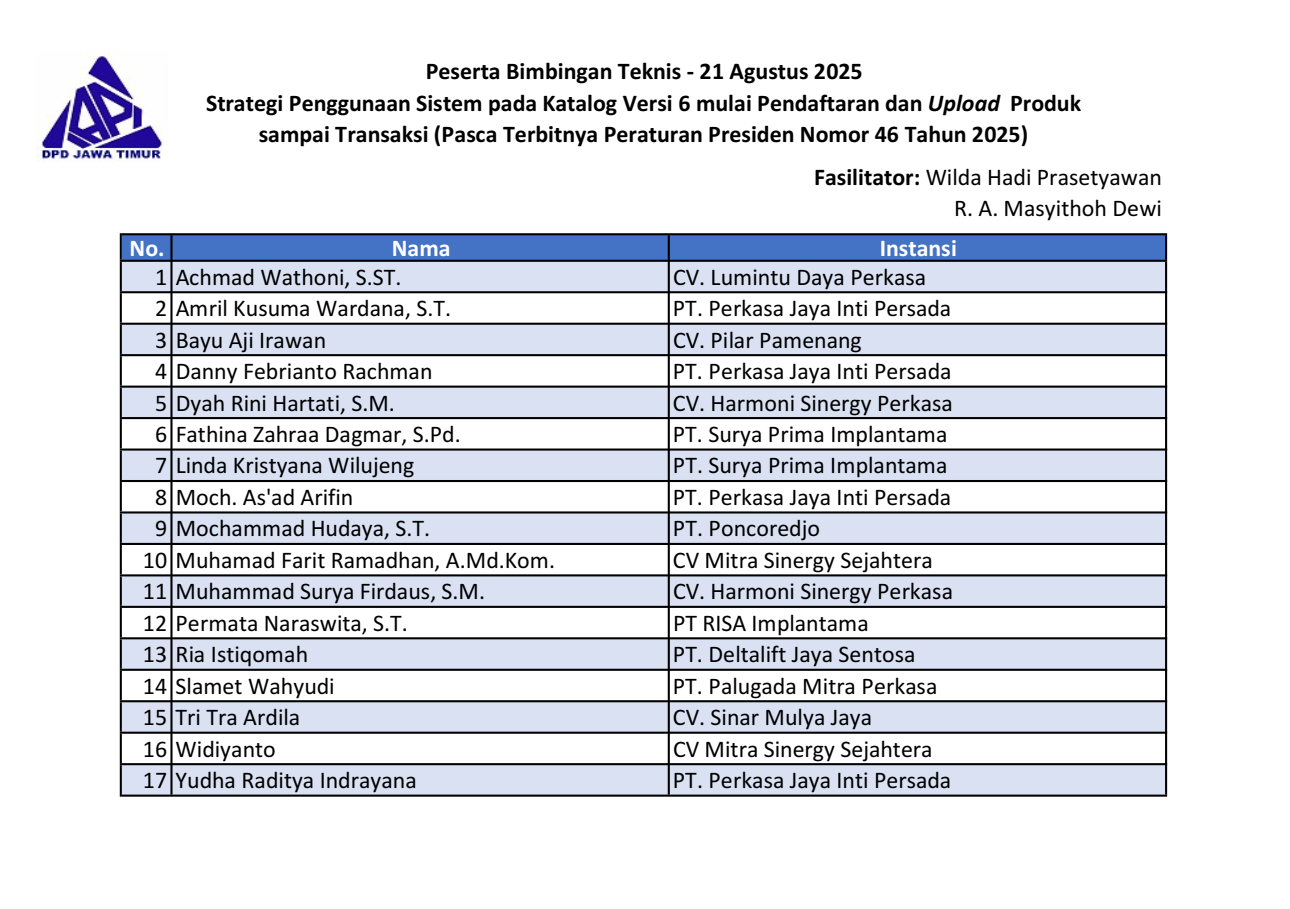 Berikut daftar nama peserta kegiatan “Bimbingan Teknis Strategi Penggunaan Sistem pada Katalog Versi 6 mulai Pendaftaran dan Upload Produk sampai Transaksi (Pasca Terbitnya Peraturan Presiden Nomor 46 Tahun 2025)” tanggal 21 Agustus 2025. Download file daftar peserta: pdf & png.