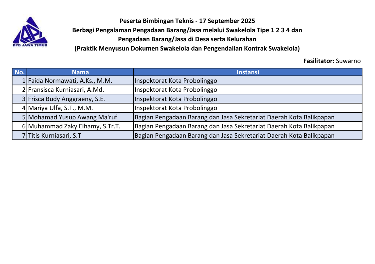 Berikut daftar nama peserta kegiatan “Bimbingan Teknis Berbagi Pengalaman Pengadaan Barang/Jasa melalui Swakelola Tipe 1 2 3 4 dan Pengadaan Barang/Jasa di Desa serta Kelurahan (Praktik Menyusun Dokumen Swakelola dan Pengendalian Kontrak Swakelola)” tanggal 17 September 2025. Download file daftar peserta: pdf & png.