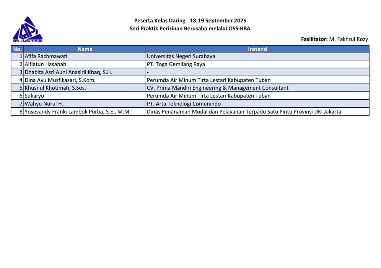 Berikut daftar nama peserta kegiatan “Kelas Daring Praktik Perizinan Berusaha melalui OSS-RBA Seri 1-2” tanggal 18-19 September 2025. Download file daftar peserta: pdf & png.