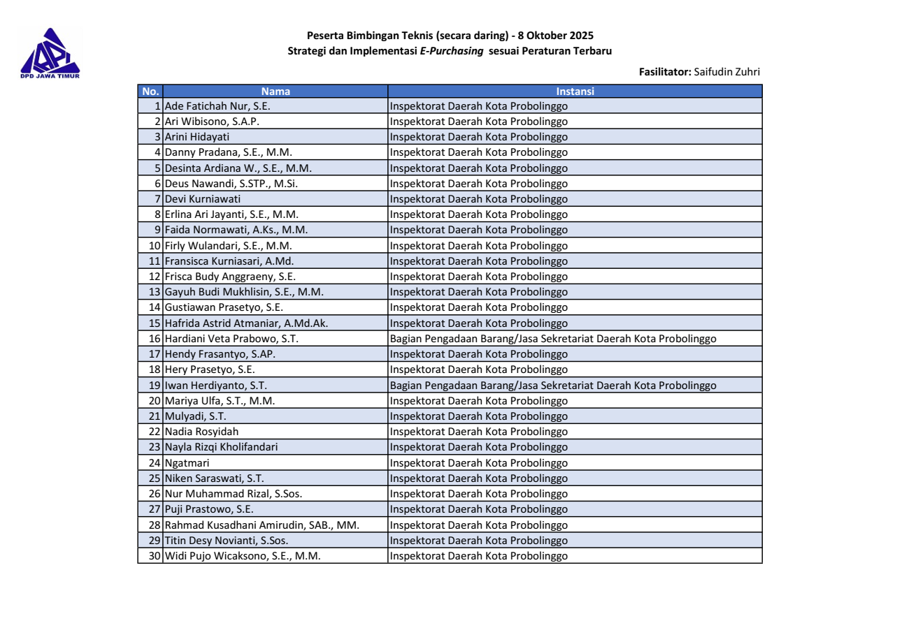 Berikut daftar nama peserta kegiatan “Bimbingan Teknis Strategi dan Implementasi E-Purchasing sesuai Peraturan Terbaru” yang dilaksanakan secara daring tanggal 8 Oktober 2025. Download file daftar peserta: pdf & png.