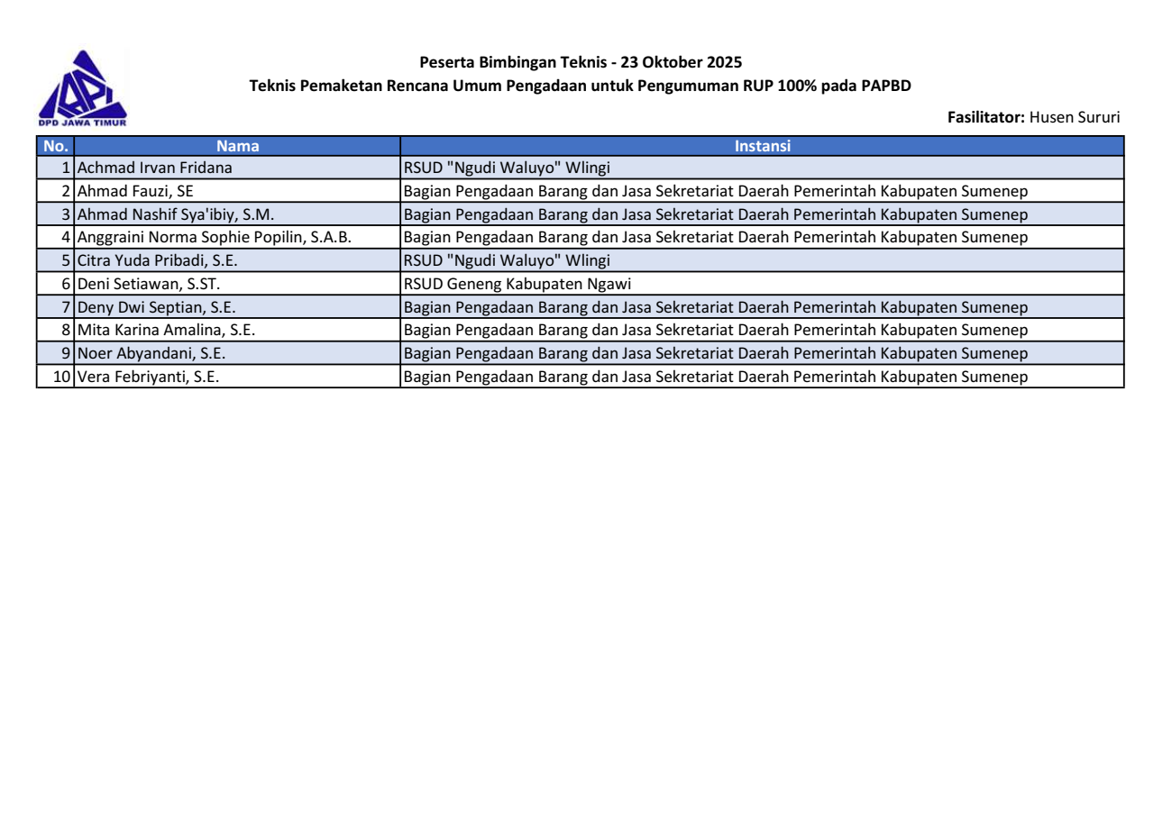 Berikut daftar nama peserta kegiatan “Bimbingan Teknis ‘Teknis Pemaketan Rencana Umum Pengadaan untuk Pengumuman RUP 100% pada PAPBD’” tanggal 23 Oktober 2025. Download file daftar peserta: pdf & png.