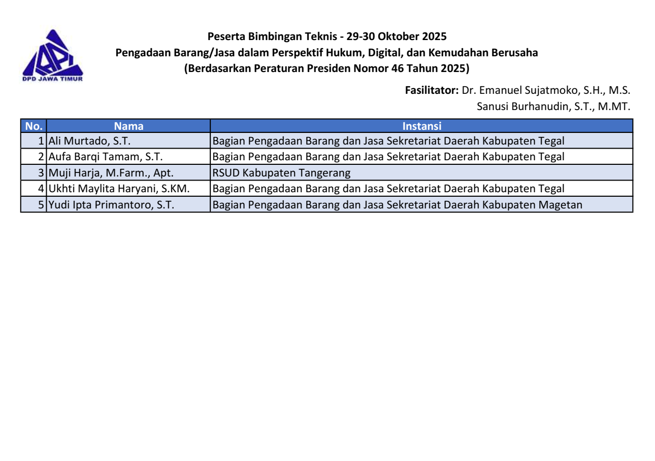 Berikut daftar nama peserta kegiatan “Bimbingan Teknis Pengadaan Barang/Jasa dalam Perspektif Hukum, Digital, dan Kemudahan Berusaha (Berdasarkan Peraturan Presiden Nomor 46 Tahun 2025)” tanggal 29-30 Oktober 2025. Download file daftar peserta: pdf & png.