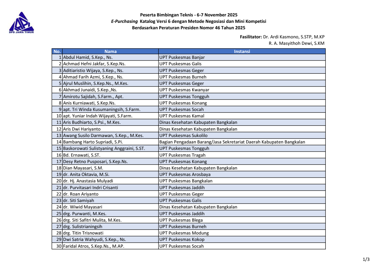 Berikut daftar nama peserta kegiatan “Bimbingan Teknis E-Purchasing Katalog Versi 6 dengan Metode Negosiasi dan Mini Kompetisi Berdasarkan Peraturan Presiden Nomor 46 Tahun 2025” tanggal 6-7 November 2025. Download file daftar peserta: pdf & png 1 2 3.