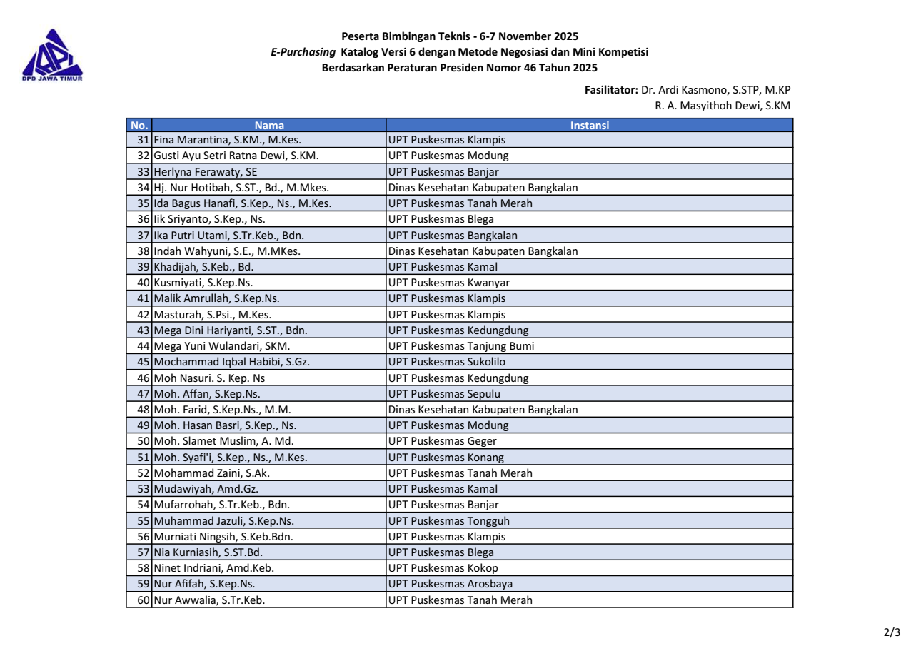 | 34 | Hj. Nur Hotibah, S.ST., Bd., M.Mkes. | Dinas Kesehatan Kabupaten Bangkalan |