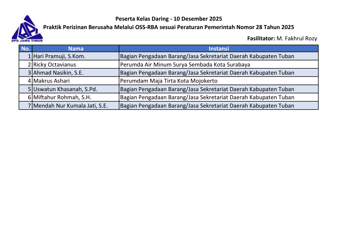 Berikut daftar nama peserta kegiatan “Kelas Daring Praktik Perizinan Berusaha Melalui OSS-RBA sesuai Peraturan Pemerintah Nomor 28 Tahun 2025” tanggal 10 Desember 2025. Download file daftar peserta: pdf & png.