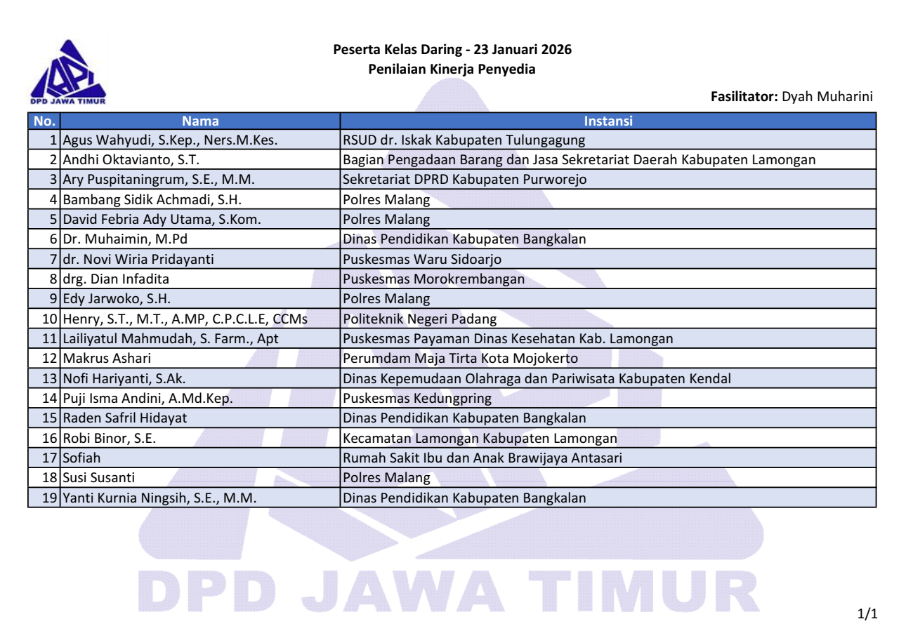 Berikut daftar nama peserta kegiatan “Kelas Daring Penilaian Kinerja Penyedia” tanggal 23 Januari 2026. Download file daftar peserta: pdf & png.