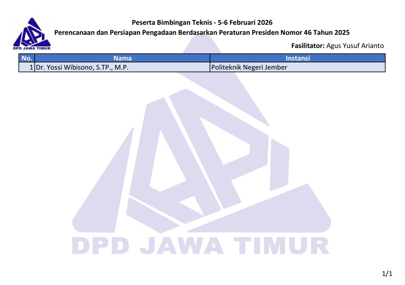 Berikut daftar nama peserta kegiatan “Bimbingan Teknis Perencanaan dan Persiapan Pengadaan berdasarkan Peraturan Presiden Nomor 46 Tahun 2025” tanggal 5-6 Februari 2026. Download file daftar peserta: pdf & png.