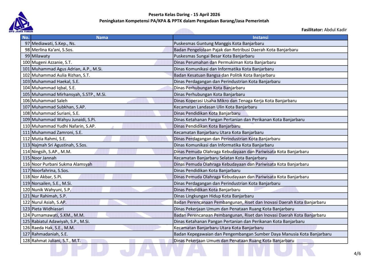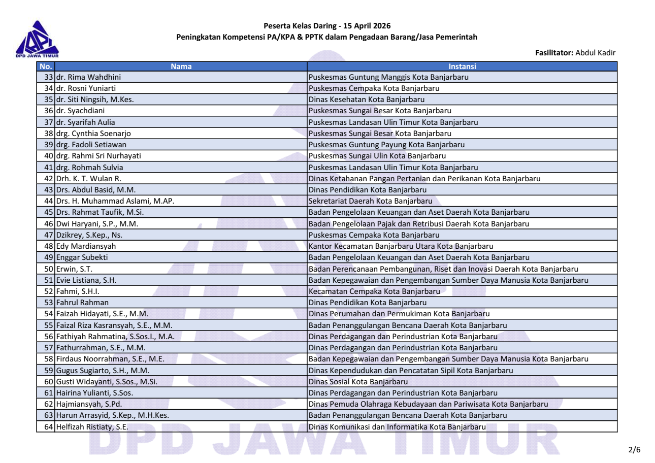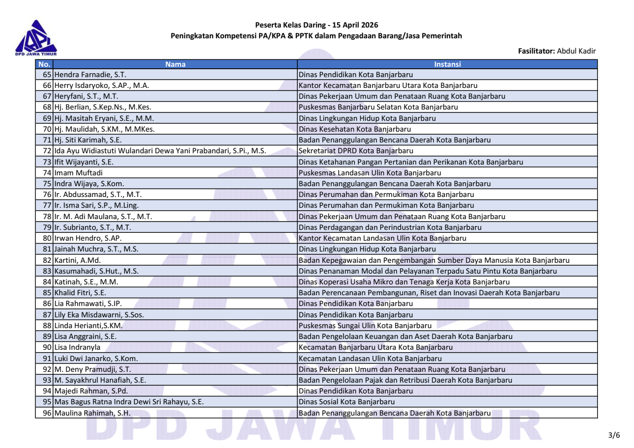 Berikut daftar nama peserta kegiatan “Kelas Daring Peningkatan Kompetensi PA/KPA & PPTK dalam PBJP” tanggal 15 April 2026. Download file daftar peserta: pdf & png (1, 2, 3, 4, 5, 6).