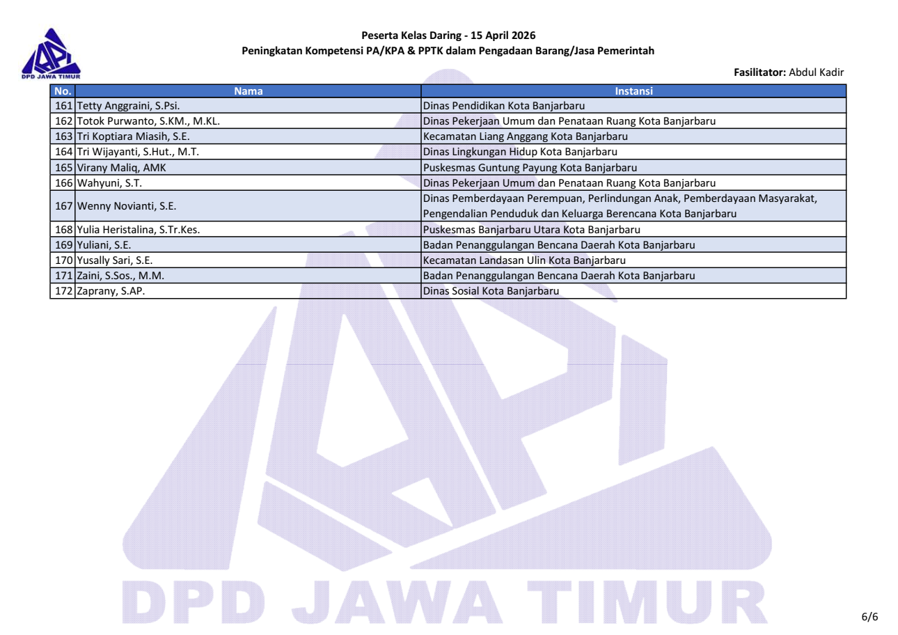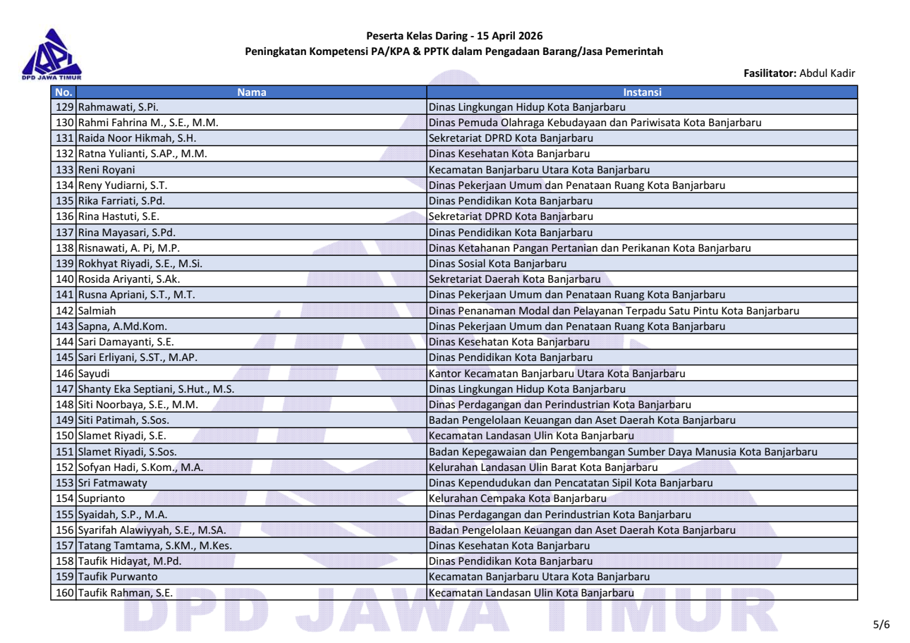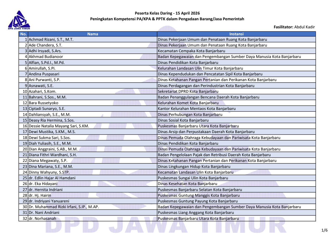 Berikut daftar nama peserta kegiatan “Kelas Daring Peningkatan Kompetensi PA/KPA & PPTK dalam PBJP” tanggal 15 April 2026. Download file daftar peserta: pdf & png (1, 2, 3, 4, 5, 6).